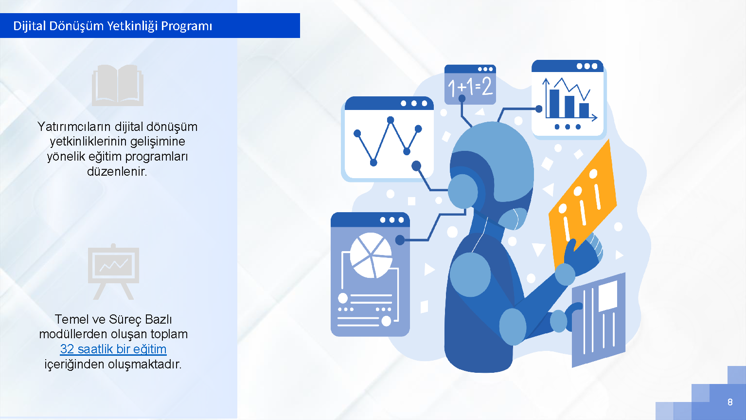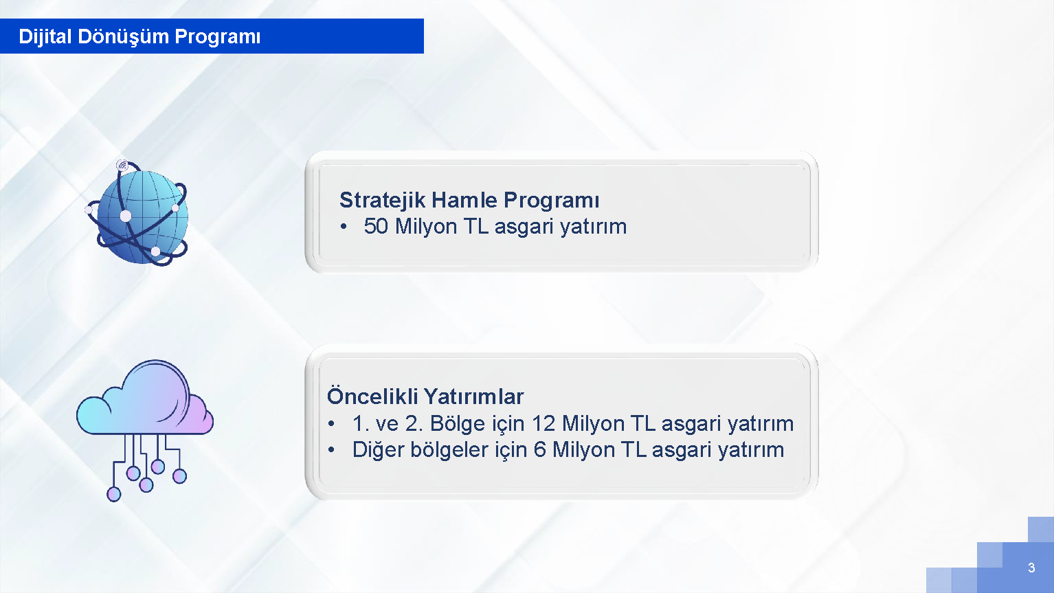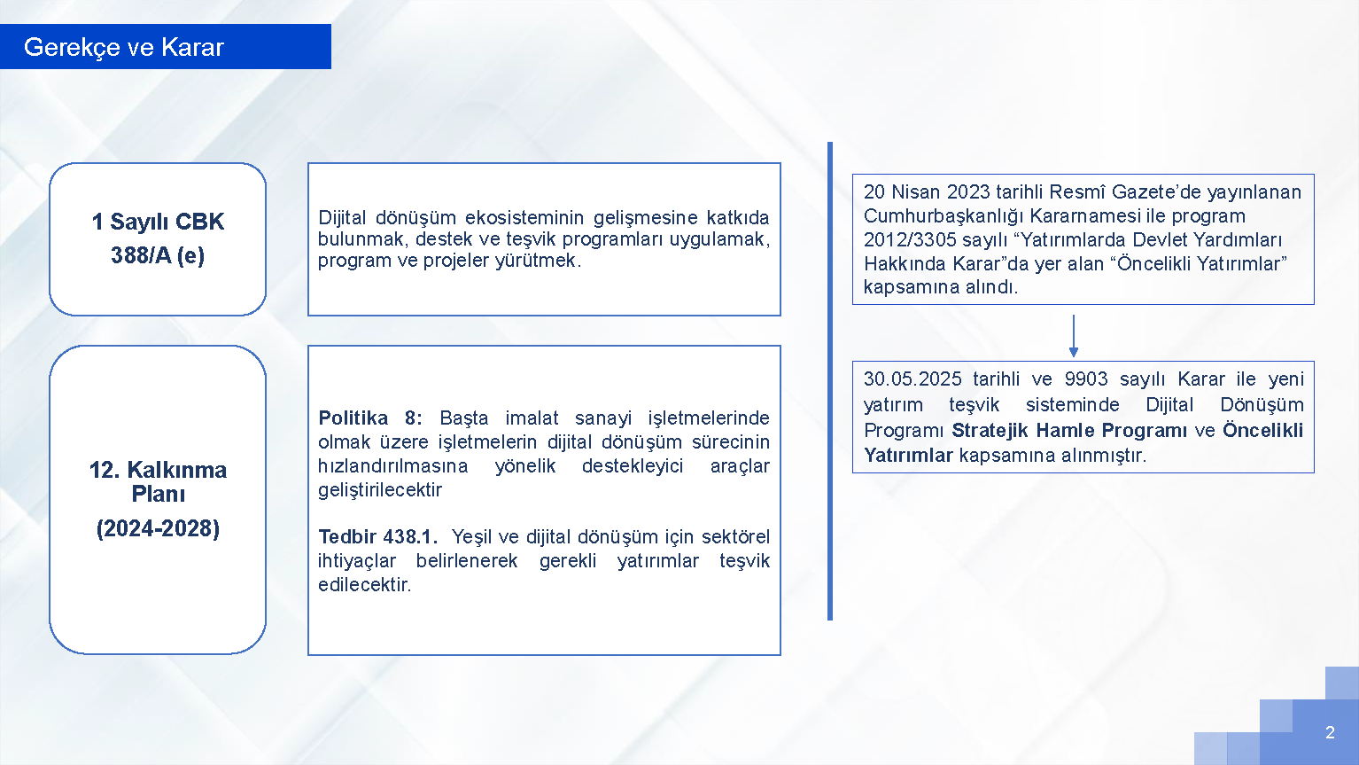 Dijitalleşmenin hızla arttığı günümüzde, sürdürülebilir teknolojiler önem kazanmış ve iş modelleri yeniden şekillenmiştir. Bu dönüşüme uyum sağlamak, Türkiye’nin rekabet gücünü koruması açısından stratejik bir gereklilik hâline gelmiştir. Dijital dönüşüm, işletmelerin verimliliğini artırmakta, kaynak kullanımını optimize etmekte ve üretim süreçlerinde esneklik sağlamaktadır. Bu kapsamda Sanayi ve Teknoloji Bakanlığı tarafından yürütülen Dijital Dönüşüm Programı, işletmelerin dijital olgunluk düzeyini yükseltmeyi ve ileri teknolojilerin kullanımını yaygınlaştırmayı hedeflemektedir. Program, 30 Mayıs 2025 tarihli ve 9903 sayılı Cumhurbaşkanı Kararı ile “Stratejik Hamle Programı” ve “Öncelikli Yatırımlar” kapsamına alınarak dijital dönüşüm yatırımlarının ulusal düzeyde desteklenmesine kurumsal bir temel kazandırmıştır. Bu kapsamda;