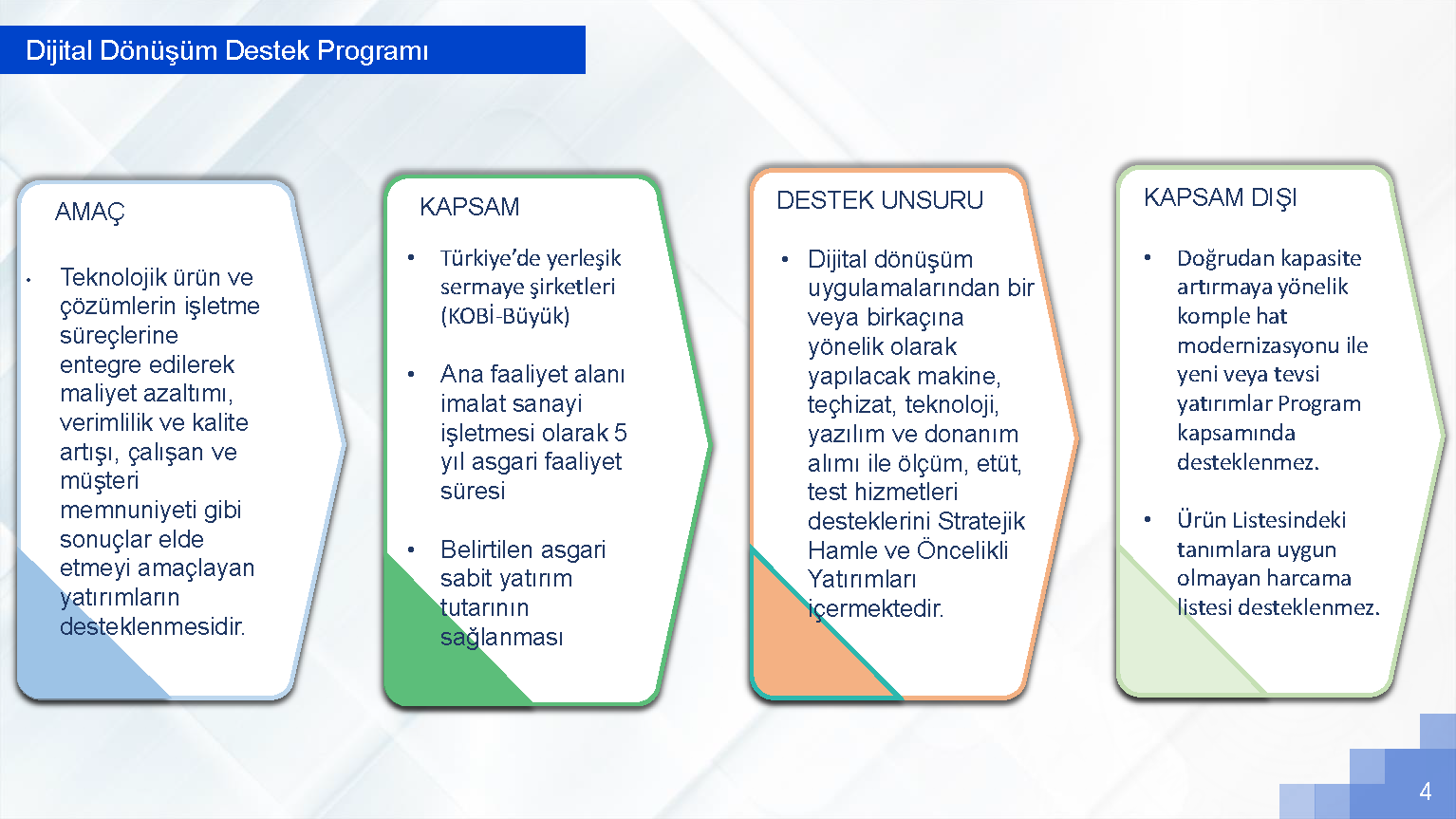 Program, katma değeri yüksek teknolojik ürün ve çözümlerin işletme süreçlerine entegrasyonunu destekleyerek;