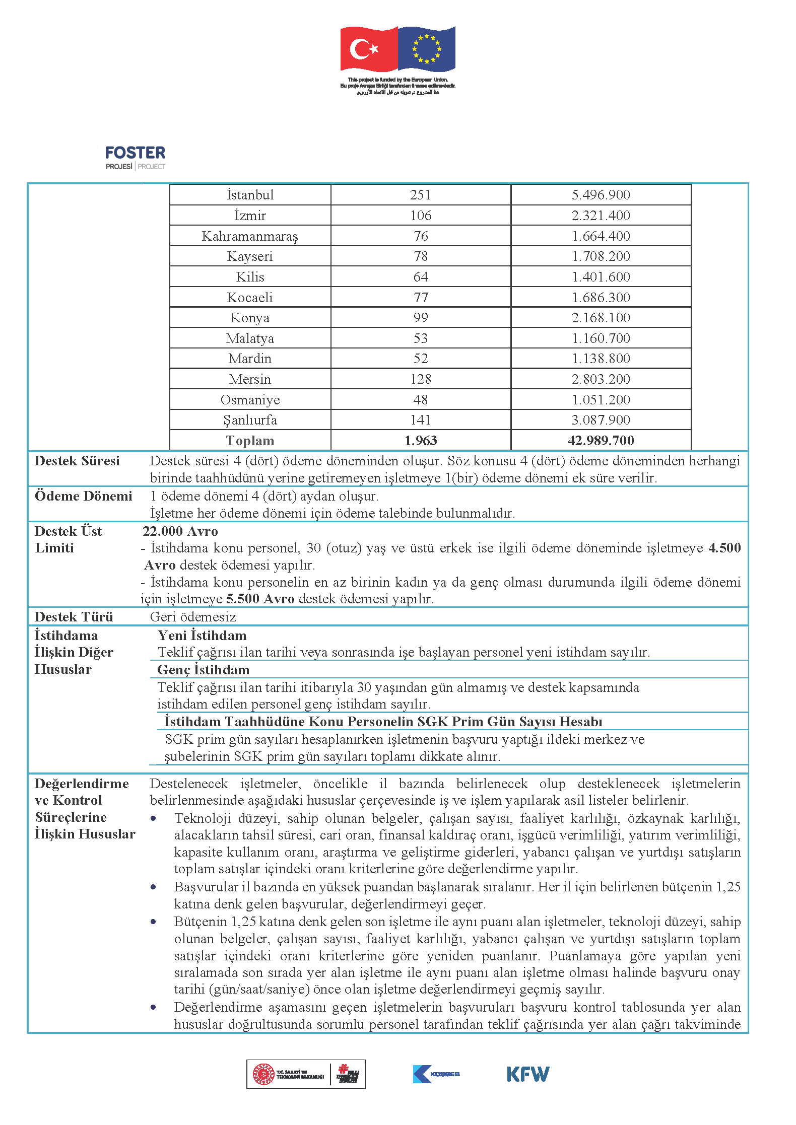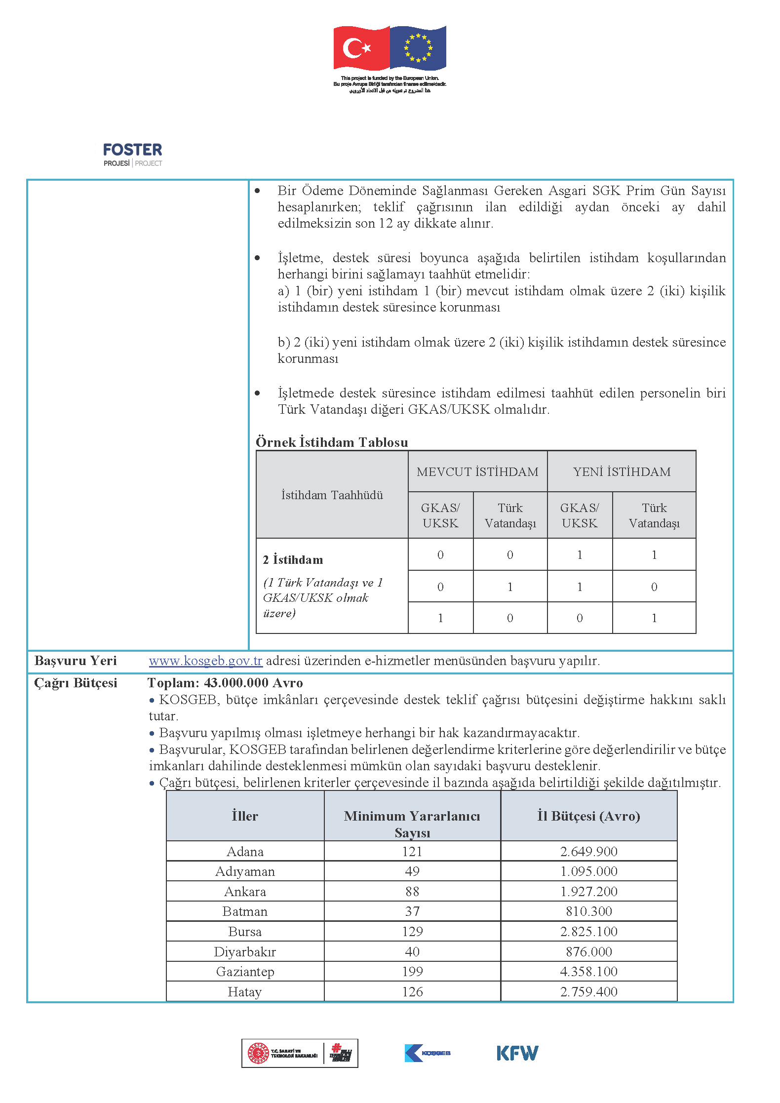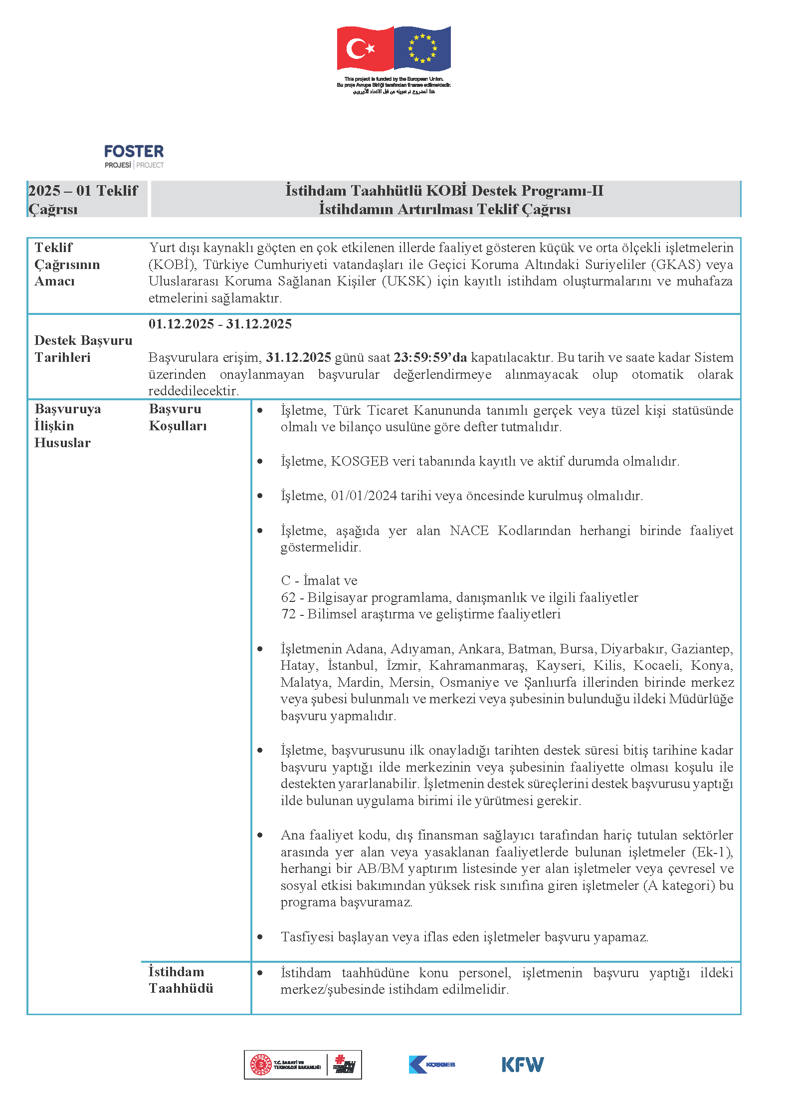 Yurt dışı kaynaklı göçten en çok etkilenen illerde faaliyet gösteren küçük ve orta ölçekli işletmelerin (KOBİ), Türkiye Cumhuriyeti vatandaşları ile Geçici Koruma Altındaki Suriyeliler (GKAS) veya Uluslararası Koruma Sağlanan Kişiler (UKSK) için kayıtlı istihdam oluşturmalarını ve muhafaza etmelerini sağlamaktır.