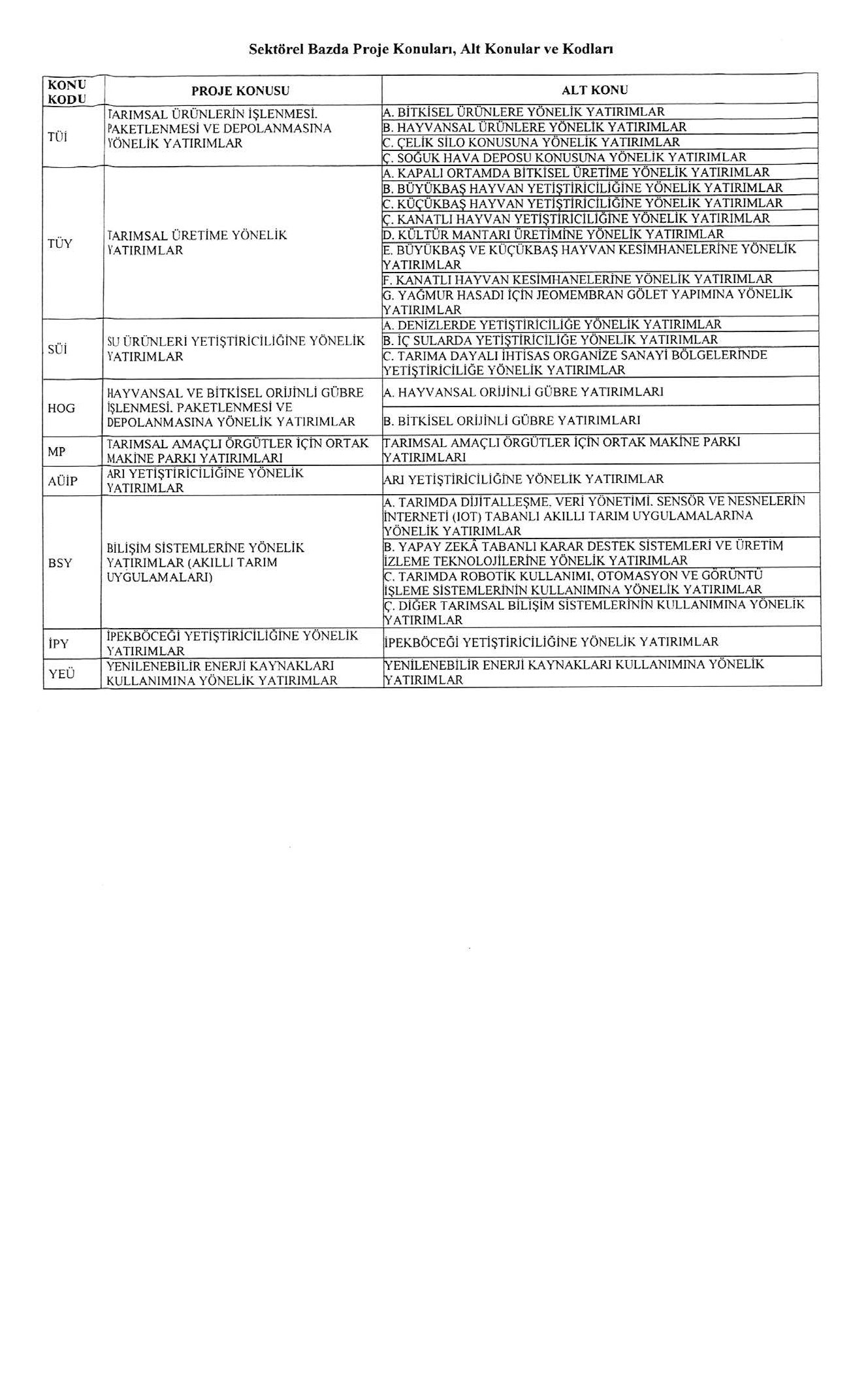 Kırsal Ekonomik Yatırımlar Proje Başvuru Konuları;
