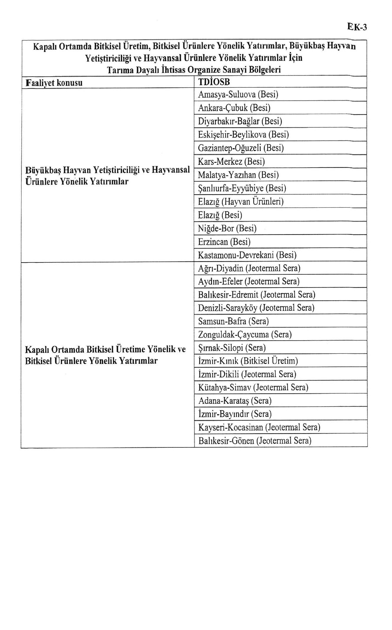 3) Tarıma dayalı ihtisas organize sanayi bölgelerinde yetiştiriciliğe yönelik yatırımlar.