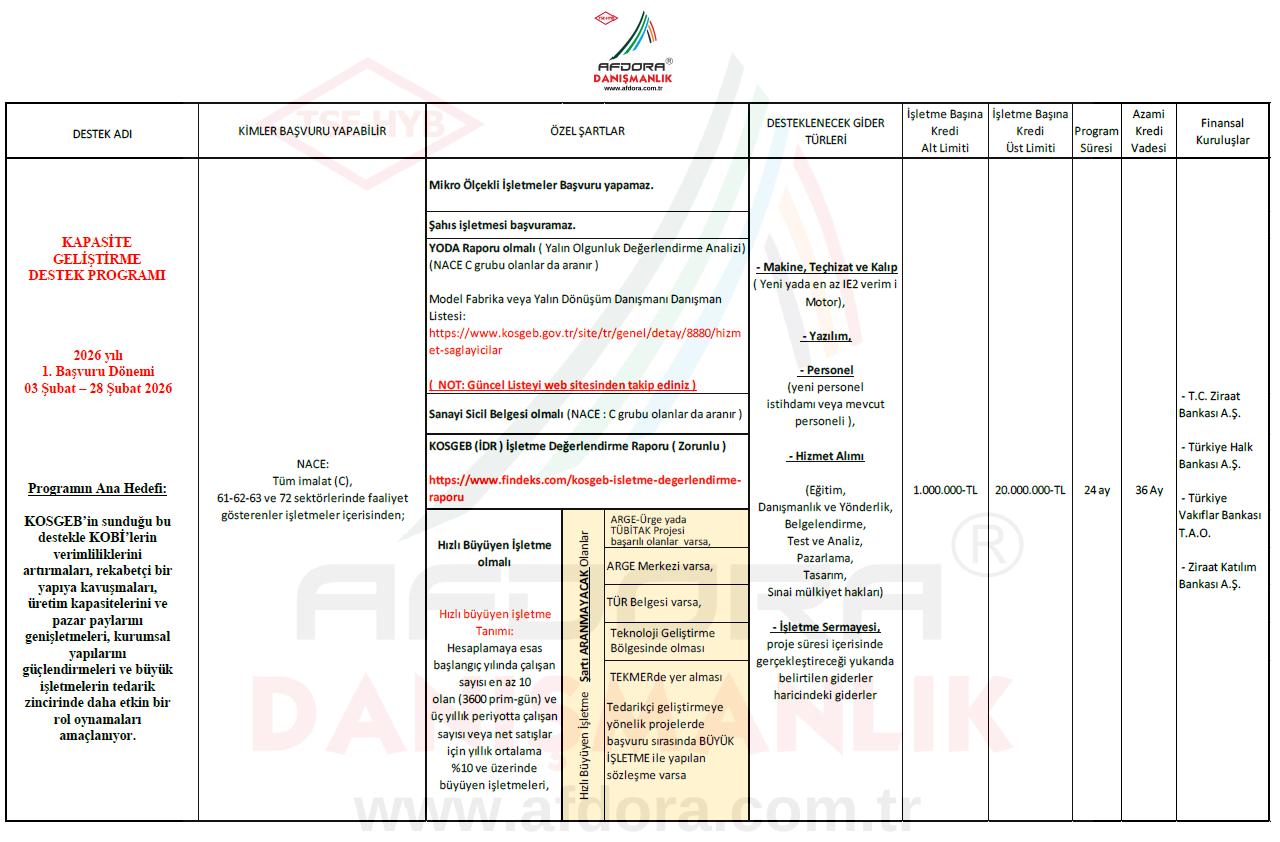 KOBİ’lerimizin üretim kapasitelerini ve rekabet güçlerini artırmak için Kapasite Geliştirme Destek Programı’nın 2026 yılı 1. Başvuru Dönemi başvuruları başladı.