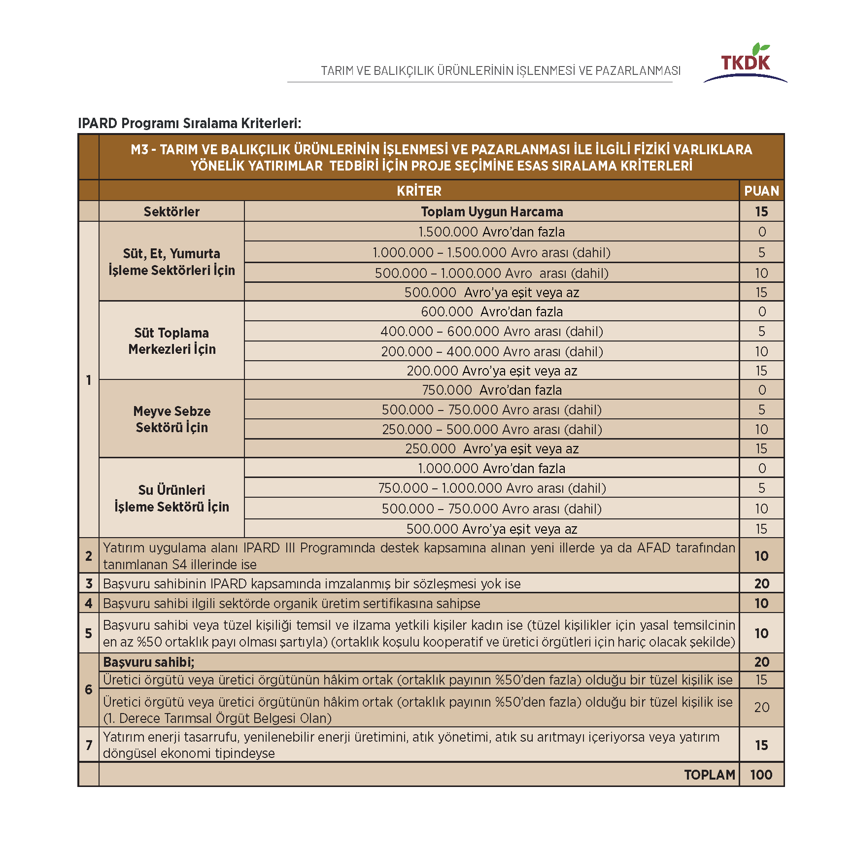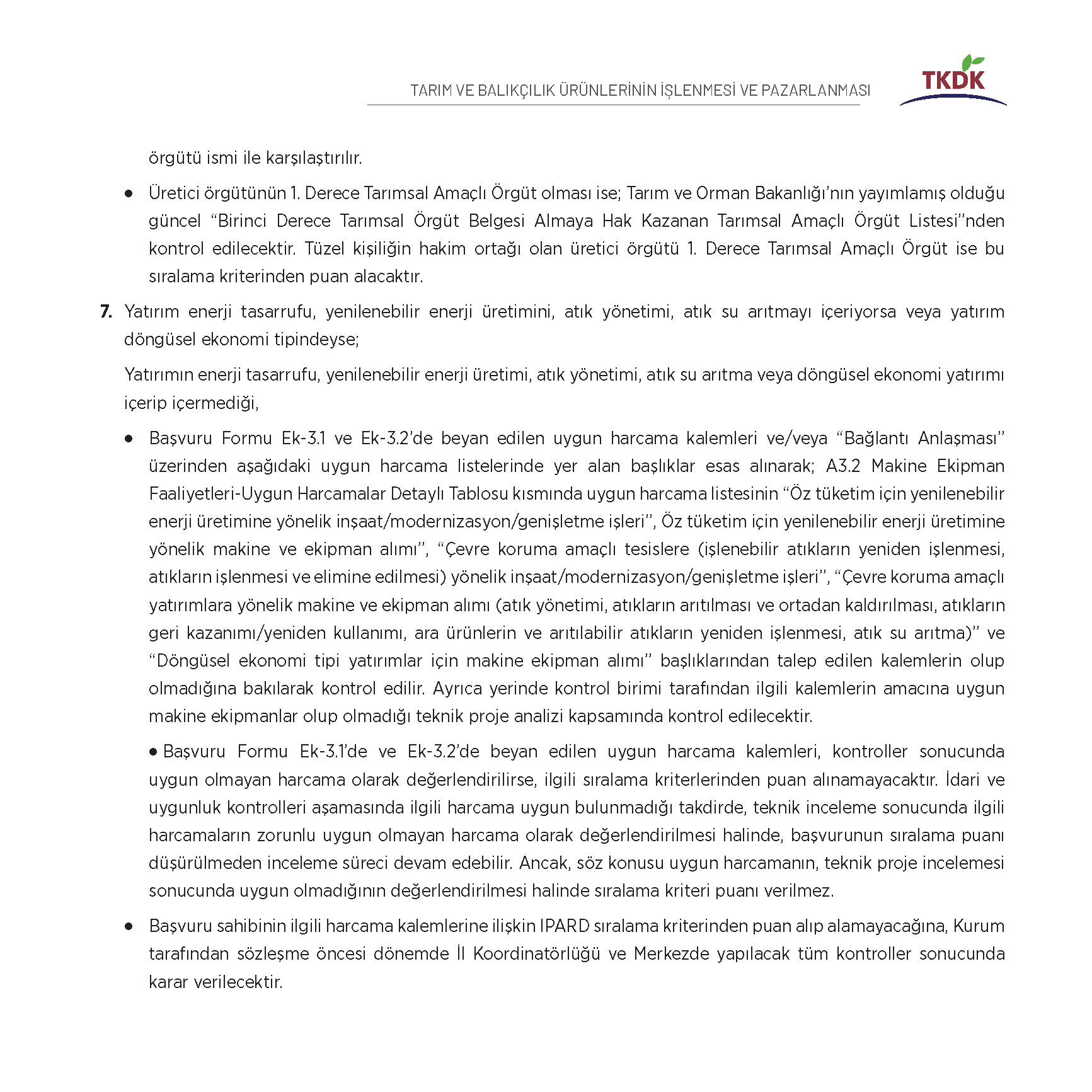 Bu Başvuru Çağrı İlanı kapsamında; “Tarım ve Balıkçılık Ürünlerinin İşlenmesi ve Pazarlanması ile İlgili Fiziki Varlıklara Yönelik Yatırımlar” tedbirinden yapım işi, makine-ekipman, hizmet ve görünürlük alımları desteğine ilişkin başvurular kabul edilecektir.